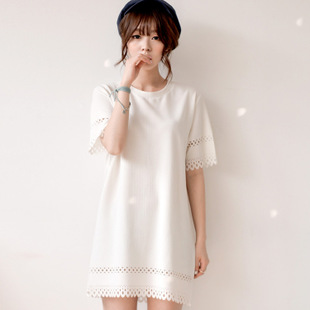 2015夏款韓國(guó)半工藝縷空?qǐng)A領(lǐng)短袖連衣裙 廠價(jià)直銷 /