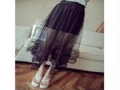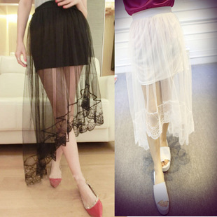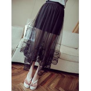 廠家直銷 韓版下擺蕾絲拼接性感高腰透視長裙不規(guī)則大擺網(wǎng)紗裙 /