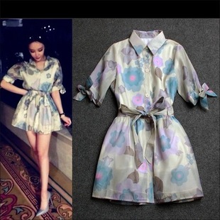 歐美大牌春夏新款襯衣領連衣裙時尚蝴蝶結中袖風衣裙 真人秀 /