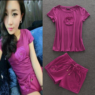 小香風立體山茶花經(jīng)典短袖T恤短褲運動休閑套裝 包邊圓領腰頭抽繩 /