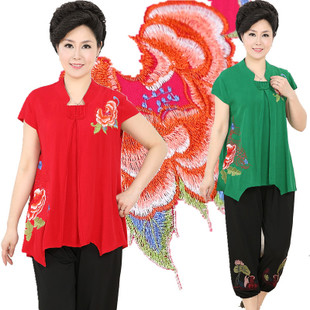 中老年女裝套裝夏季新款短袖T恤民族風媽媽裝加肥加大刺繡九分褲 /