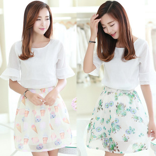 實(shí)拍2015新款荷葉袖雪紡上衣+冰淇淋印花半裙兩件套 套裝精品 /