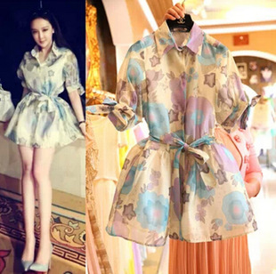 2015歐洲站修身顯瘦中袖娃娃領印花裙子 歐根紗綁帶雪紡連衣裙 /
