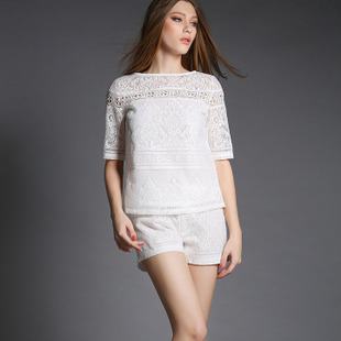 實拍混批2015夏歐洲站新款女裝蕾絲雪紡衫純色短褲套裝兩件套代發(fā) /