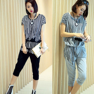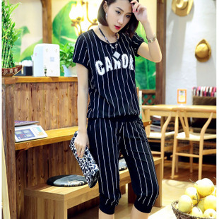 2015夏裝新款休閑套裝 運(yùn)動女黑色條紋圓領(lǐng)T恤顯瘦 褲套裝 /