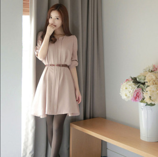 2015春夏女裝 新款韓版裸色褶雪紡5分袖腰帶小V領(lǐng)顯瘦連衣裙 /