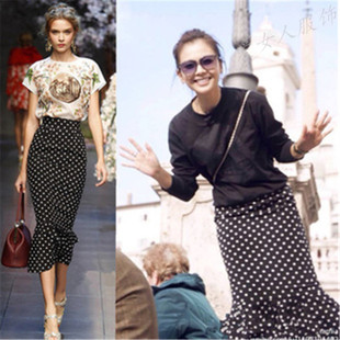 2015新款春裝歐美波點魚尾長裙包臀裙高腰修身雪紡半身裙 /