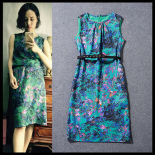 2015夏裝歐美圓領(lǐng)無袖背心裙大碼女裝雪紡印花連衣裙長裙一件代發(fā) /