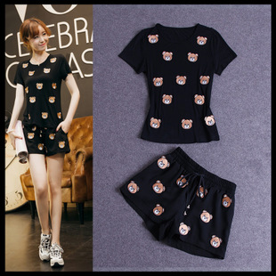 歐美時尚新款夏季女裝修身顯瘦小熊刺繡棉T+短褲休閑套裝一件代發(fā) /