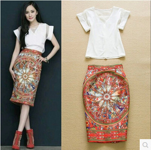 2015爆款楊冪同款氣質(zhì)顯瘦V領(lǐng)襯衫 復(fù)古印花包臀半裙兩件裙套裝 /