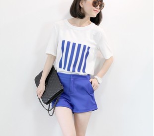一件代發(fā)韓版豎條紋印花短袖t恤衫+闊腿短褲套裝女裝夏季二件套 /
