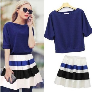 歐洲站2015夏休閑套裝女裝時(shí)尚蝙蝠袖短袖上衣+條紋半身裙兩件套 /