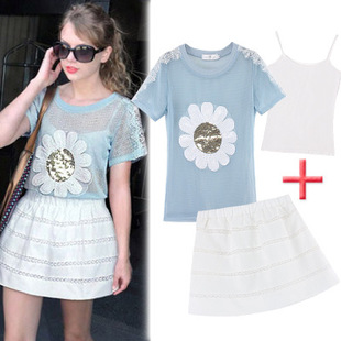 歐洲站夏季女小香風(fēng)圓領(lǐng)套頭網(wǎng)狀亮片短袖T恤+褲裙套裝二件套 /