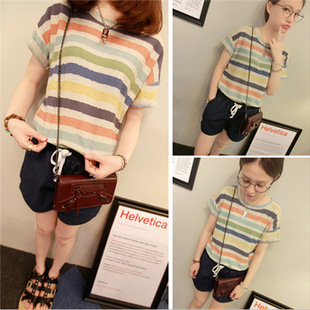 2015夏裝新款 夏日清爽彩色條紋挽邊袖短袖T 128 /