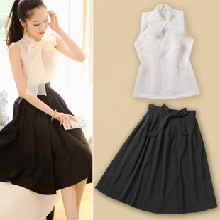 歐美范明星同款2015夏季時(shí)尚新款蝴蝶領(lǐng)歐根紗背心衫+修身大擺裙 /