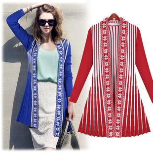 歐美風(fēng)快時(shí)尚女裝2015秋季新款中長款豎條紋毛衫大擺開衫針織衫 /