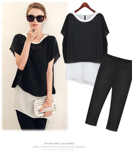 歐美風(fēng)快時(shí)尚2015夏季新款時(shí)尚黑白不規(guī)則拼接雪紡衫七分褲套裝 /