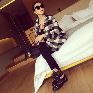 代理加盟2014秋裝外套 棉料黑白格子加厚寬松風(fēng)長襯衣大碼外套女 /