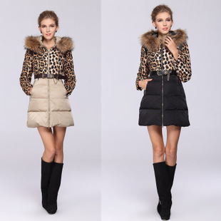 2014秋冬新品歐洲站外貿(mào)高檔女裝時尚大毛連帽領(lǐng)長袖豹紋羽絨服 /
