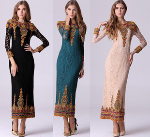 2015春秋新款復(fù)古女裝 歐洲站宮廷刺繡花修身顯瘦蕾絲連衣裙長裙 /