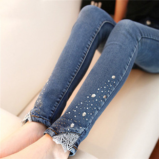 批發(fā)2015春夏新款韓版顯瘦潮帶鉆蕾絲拼接鉛筆褲小腳女士牛仔褲 /