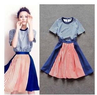 2015春裝新款 歐美大牌佟麗婭明星同款短袖條紋上衣+條紋半裙套裝 /