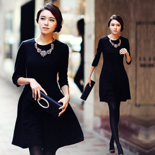 歐洲站秋冬季赫本小黑裙 大碼女裝百褶裙修身大擺A字七分袖連衣裙 /