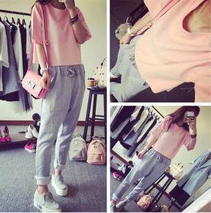 1009# 2015春夏新款純色蝙蝠袖寬松短T+休閑哈倫褲 運(yùn)動套裝女 /