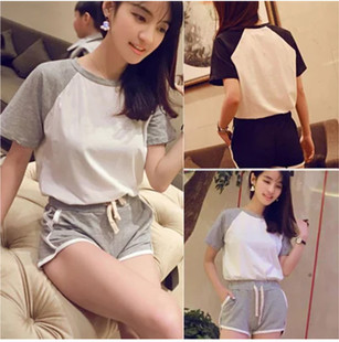 2905# 2015夏季新款插肩袖短袖T恤+ 開衩短褲休閑運(yùn)動套裝女 /