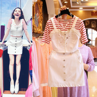 2015春裝新款日系VIVI同款條紋T恤背帶包臀裙三件套套裝優(yōu)質版 /