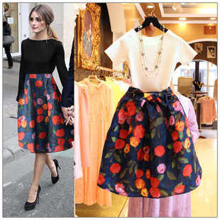 歐洲站2015春夏新款一字領短袖上衣+花朵印花半身裙套裝 模特實拍 /