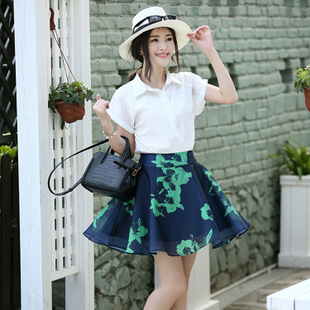 2015夏季新款女裝修身名媛套裝襯衫印花裙兩件套 /