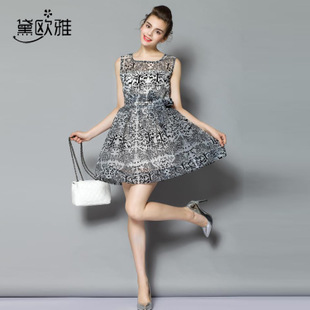 2015夏季新款女裝印花背心裙歐根紗連衣裙蓬蓬裙 歐美時(shí)尚連衣裙 /