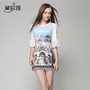 歐洲站 2015夏季新款女裝連衣裙小香風(fēng)燈籠袖印花a字連衣裙 夏 /