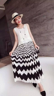 2015夏季新款套裝女 歐韓時(shí)尚圓領(lǐng)無(wú)袖上衣+波浪百褶半身裙兩件套 /