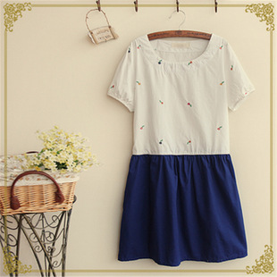 • 夏季新款 日系森女系小清新圓領(lǐng)小花刺繡拼接撞色短袖連衣裙 /