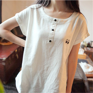• 夏季新款 森女系小清新卡通刺繡寬松棉麻短袖T恤女 代理代發(fā) /