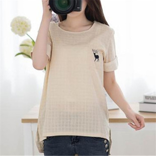 • 2015年新款女裝 日系森女系棉麻刺繡梅花鹿短袖T恤女 /