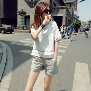 • 歐洲站夏新品 時尚休閑棉麻短袖上衣+短褲兩件套氣質(zhì)套裝女 /