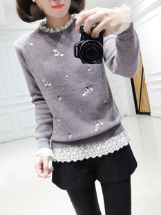 冬裝新款韓版蕾絲花邊繡花寬松顯瘦長袖針織衫女打底衫 /