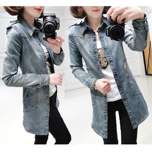 春季女裝韓版墊肩修身顯瘦長款牛仔外套女牛仔襯衫七分袖 /