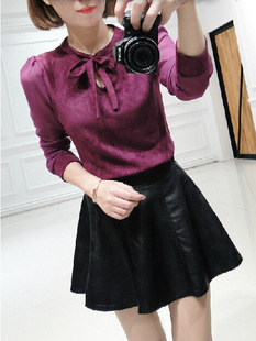 2014秋裝新款女裝蝴蝶結(jié)雪紡泡泡袖麂皮絨小上衣打底衫襯衫 /