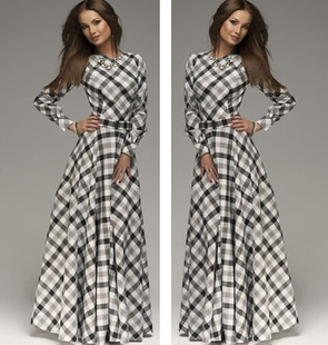 2015新款速賣通爆款格子長款連衣裙 /