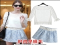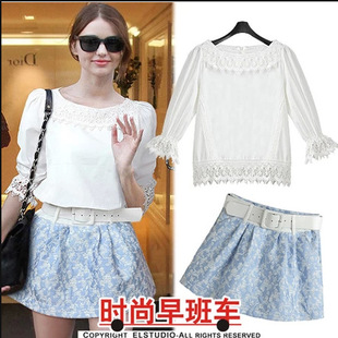 2015新款女裝歐洲站小清新蕾絲上衣二件套印花短裙套裝送腰帶 /