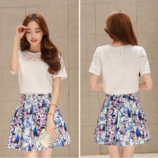 蓬蓬a字裙 圓領(lǐng)精品兩件套裝修身韓版短袖2015夏季蕾絲印花連衣裙 /