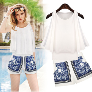 2015夏季新款歐洲站雪紡寬松上衣+青花瓷印花短褲套裝 /