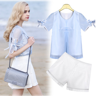 2015夏裝歐根紗雪紡衫上衣短褲兩件套時尚休閑套裝一件代發(fā) /