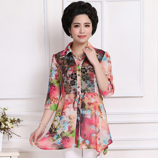 2015新款中老年女裝襯衫花案雪紡大碼修身印花中長(zhǎng)款中袖襯衣 /
