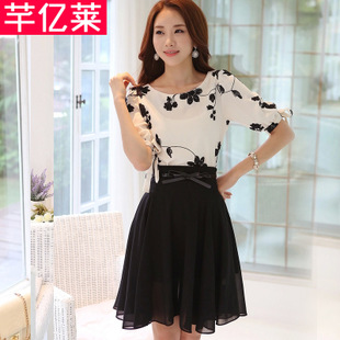 2015胖mm夏裝套裝裙 中袖印花雪紡衫+大擺中裙兩件套連衣裙 /