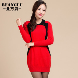 北方鹿氣質(zhì)女式春季打底衫 拼色翻領(lǐng)修身中長款貂絨針織衫 批發(fā) /